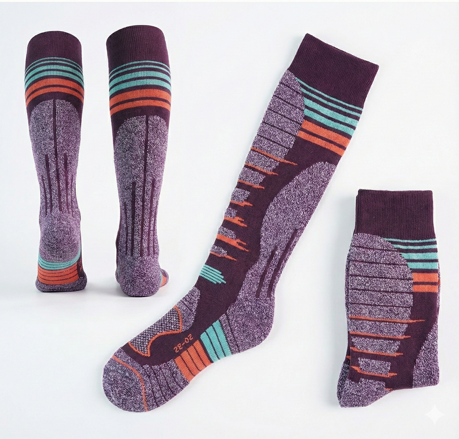 Aceste șosete tehnice de schi și snowboard sunt proiectate pentru a oferi echilibrul perfect între căldura naturală, suportul muscular și durabilitate. Designul vibrant în nuanțe de mov, cu accente dinamice de turcoaz și portocaliu, ascunde o inginerie textilă avansată, menită să îți mențină picioarele uscate, calde și energizate de la prima urcare până la ultimul après-ski.